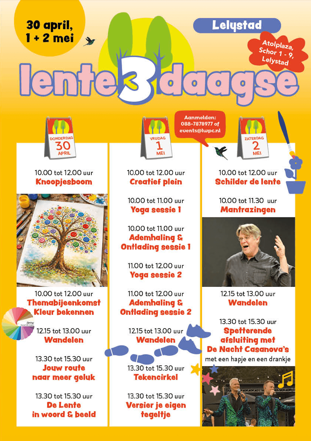 Ook dit jaar mogen jullie weer genieten van maar liefst drie 3-daagses! De eerste van dit jaar staat al voor jullie klaar: op donderdag 30 april, vrijdag 1 mei en zaterdag 2 mei vieren we samen de lente tijdens onze feestelijke Lente-3-Daagse bij Atolplaza in Lelystad. Drie dagen vol inspiratie, ontmoeting, ontspanning en creativiteit, en zoals altijd is deelname helemaal gratis.